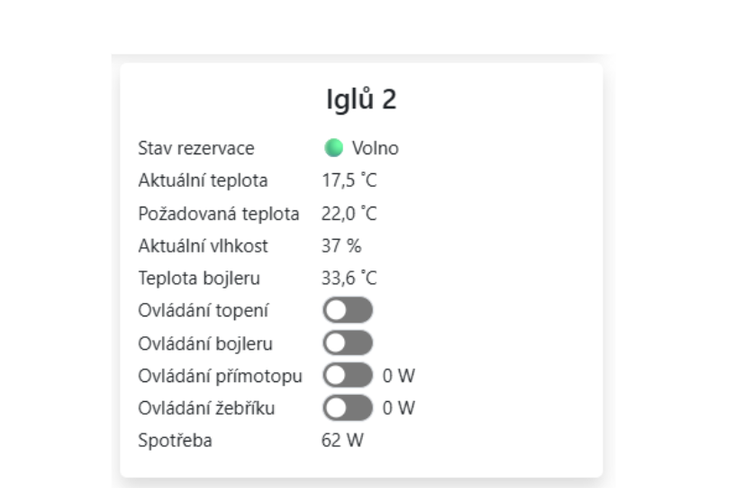 „Takto může vypadat například přehled stavu jednotlivé chatky. Tato chatka aktuálně není obsazená. IQstat snížil odběr celé chatky na minimum. Až se bude blížit doba příjezdu, vytopí se chatka automaticky na požadovanou teplotu a vše se nastaví pro komfortní přivítání hostů,“ popisuje Falta výše uvedený obrázek.