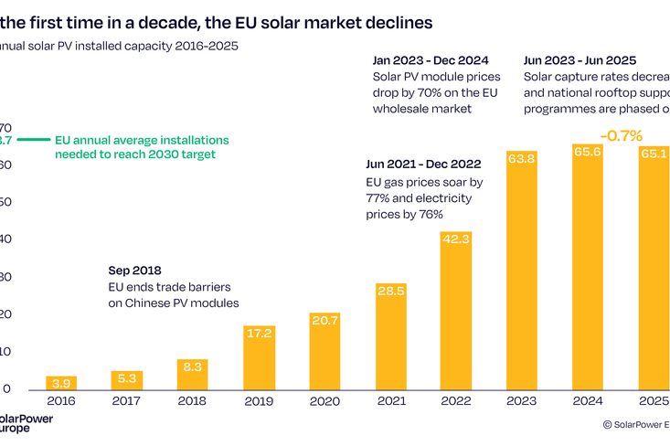 Ačkoliv Evropská unie splnila milník 320 gigawattů instalovaného výkonu a solární energie se v červnu 2025 poprvé stala největším zdrojem elektřiny v Unii, celková dynamika trhu oslabila. Vývoj trhu nicméně potvrzuje dřívější varování, že bez cílených politických zásahů tempo výstavby neudrží hodnoty z let 2021 až 2023.