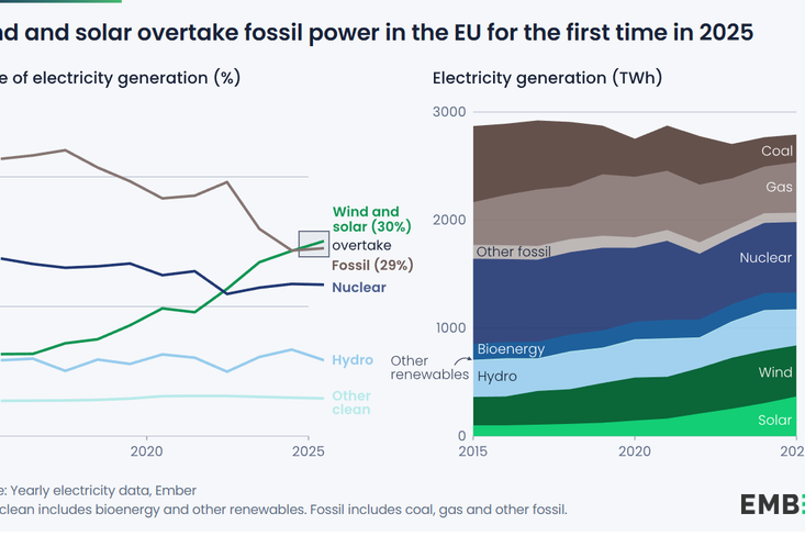 Podle studie dosáhl společný podíl větru a slunce na výrobě elektřiny v EU 30 procent, zatímco fosilní paliva klesla na 29 procent. Ještě před pěti lety přitom větrné a solární zdroje pokrývaly jen pětinu evropské výroby. Čistá elektřina se tak definitivně přesunula z okraje energetického mixu do jeho hlavního proudu.