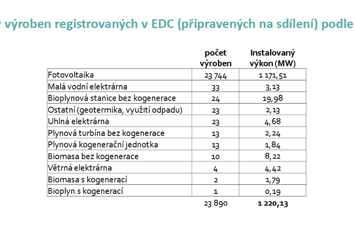 Z hlediska technologií je sdílení elektřiny v Česku jednoznačně doménou fotovoltaiky. V registru Elektroenergetického datového centra je připraveno ke sdílení přes 23 tisíc fotovoltaických elektráren s instalovaným výkonem zhruba 1,17 gigawattu.
