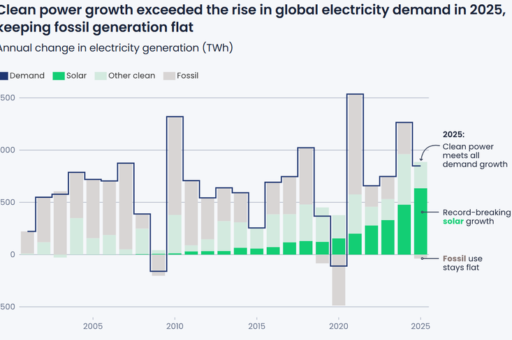 Růst výroby z obnovitelných zdrojů v roce 2025 poprvé plně pokryl zvýšenou globální poptávku po elektřině, zatímco výroba z fosilních paliv zůstala prakticky beze změny nebo mírně klesla. Podle analytiků think-tanku Ember a Mezinárodní energetické agentury (IEA) může jít o důležitý zlom v globálním odklonu od fosilních paliv.